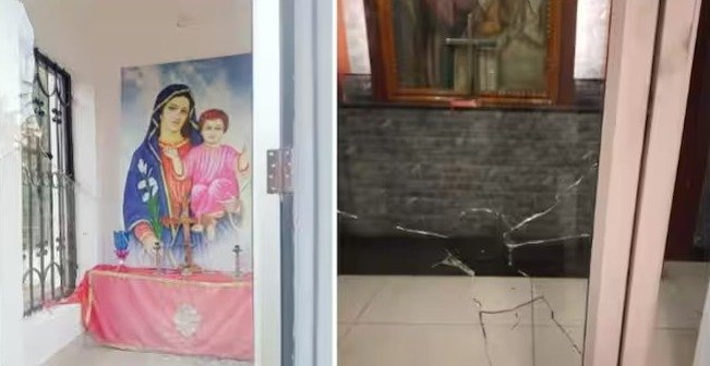 പള്ളിക്ക് സമീപമുള്ള ഗ്രോട്ടോയുടെ തുണിനും കേടുപാടുണ്ടായി. അതേസമയം പുളിയന്മല കമ്പനിപ്പടിയില് പുലര്ച്ചെ ഒന്നരയോടെ ബൈക്കിലെത്തിയ രണ്ടംഗ സംഘം ചില്ല് എറിഞ്ഞു തകര്ത്തതിന്റെ സൂചന പൊലീസിനു ലഭിച്ചിട്ടുണ്ട്.