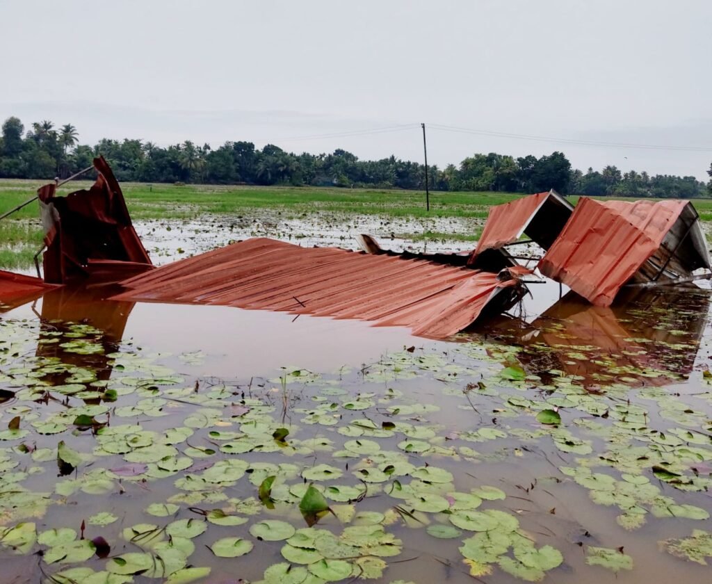 കുമരകം : ബുധനാഴ്ച വൈകിട്ട് ആഞ്ഞടിച്ച കൊടുങ്കാറ്റിൽ വീടിൻ്റെ മേൽക്കുര കാറ്റടുത്ത് സമീപത്തെ പാടത്ത് ഇട്ടു. ഷീറ്റുകൊണ്ട് നിർമ്മിച്ച മേൽ കൂരയാണ് കാറ്റ് പറത്തിയത്.