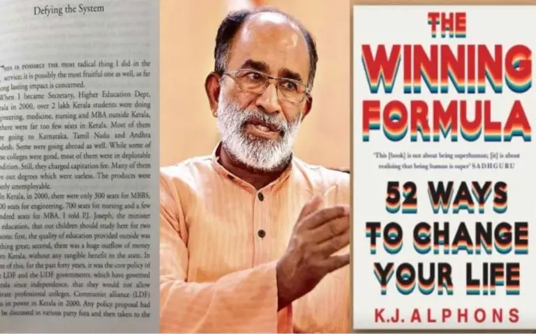 ‘ദ വിന്നിങ് ഫോർമുല, 52 വേയ്സ് ടു ചേഞ്ച് യുവർ ലൈഫ്’ എന്ന പുസ്തകത്തിലാണ് കണ്ണന്താനത്തിൻ്റെ വെളിപ്പെടുത്തലുകൾ. ഉദ്യോഗസ്ഥന് ഇച്ഛാശക്തിയുണ്ടെങ്കിൽ എത്ര കടുത്ത നടപടിയുമെടുക്കാൻ രാജ്യത്ത് സാധിക്കും അൽഫോൻസ് കണ്ണന്താനം പറയുന്നു.