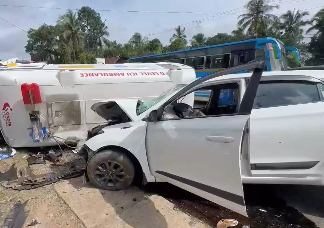 ആംബുലൻസിൽ ഉണ്ടായിരുന്ന കണ്ണൂർ സ്വദേശിയായ കുഞ്ഞിരാമൻ (81), കാർ യാത്രികയായ കുന്നംകുളം സ്വദേശി പുഷ്പ (52) ആണ് മരിച്ചത്. ചികിത്സകഴിഞ്ഞ് ആശുപത്രിയില് നിന്ന് മടങ്ങുമ്പോഴാണ് ആംബുലൻസ് അപകടത്തിൽ പെട്ടത്.