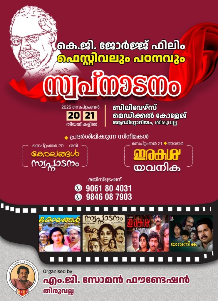 തിരുവല്ല : മധ്യതിരുവിതാംകൂറിൻ്റെ അഭിമാനമായ വിശ്വവിഖ്യാത ചലച്ചിത്ര സംവിധായകൻ . കെ. ജി ജോർജിൻ്റെ രണ്ടാം ചരമവാർഷികത്തോടനുബന്ധിച്ച് എം.ജി സോമൻ ഫൗണ്ടേഷൻ്റെ നേതൃത്വത്തിൽ “സ്വപ്നാടനം ” എന്ന പേരിൽ കെ.ജി ജോർജ് ഫിലിം ഫെസ്റ്റിവലും പഠനവും സെപ്റ്റംബർ 20, 21 തീയതികളിൽ തിരുവല്ല ബിലിവേഴ്സ് മെഡിക്കൽ കോളേജ് ആംഫി തീയേറ്ററിൽ നടക്കും.