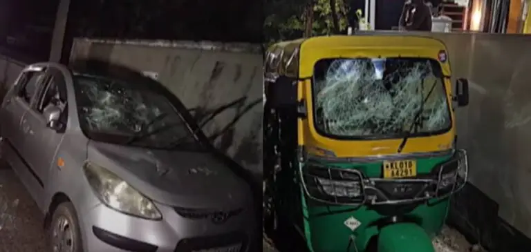 രാജേഷിന്റെ വീടിന് നേരെ നാടന് പടക്കമെറിഞ്ഞ സംഘം, വീട്ടുമുറ്റത്തും റോഡിലും ഉണ്ടായിരുന്ന മൂന്ന് ഓട്ടോറിക്ഷകളും രണ്ട് കാറുകളും ഒരു ബൈക്കും അടിച്ചുതകർത്തു.