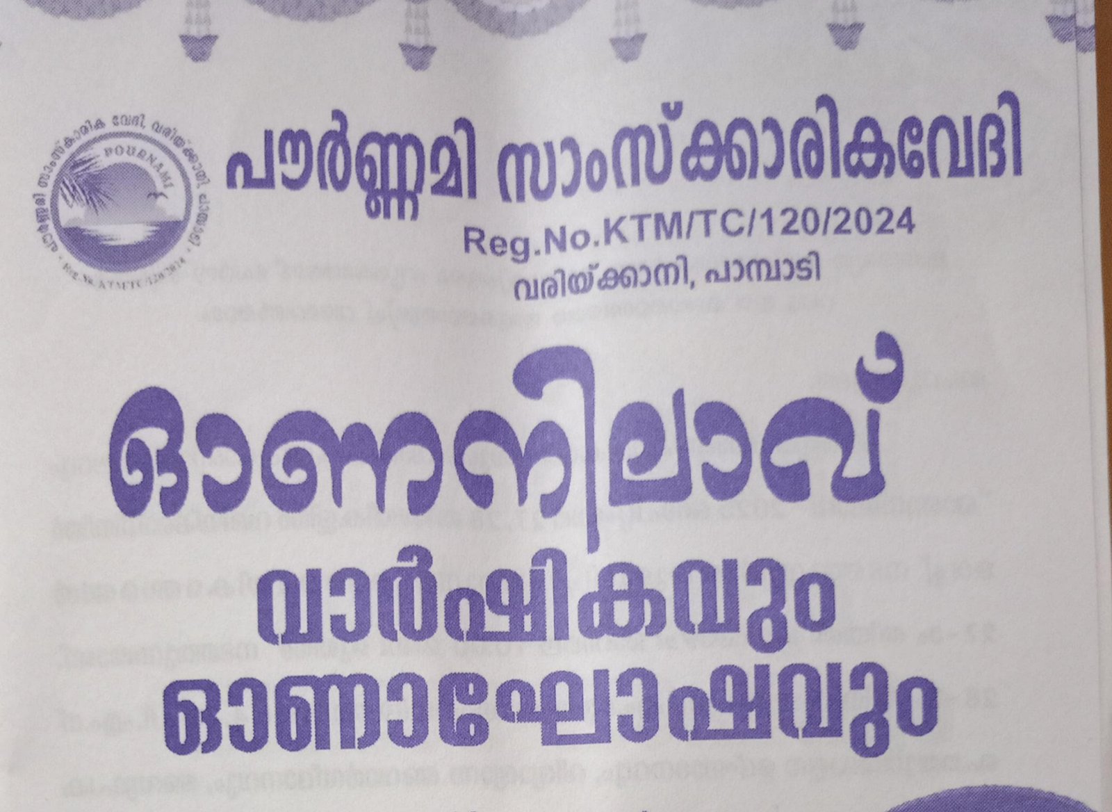 പാമ്പാടി ഗ്രാമപഞ്ചായത്ത് വൈസ് പ്രസിഡന്റ് പി.ഹരികുമാർ വിവിധ മേഖലകളിൽ മികവ് പുലർത്തിയവരെ ആദരിക്കും. പാമ്പാടി ഗ്രാമപഞ്ചായത്ത് അംഗം അച്ചാമതോമസ് സമ്മാനദാനം നിർവഹിക്കും. സെക്രട്ടറി ബിജു.ബി നായർ, പ്രശാന്തി റെസിഡൻസ് അസോസിയേഷൻ സെക്രട്ടറി ഉഷാകുമാരി പി.കെ, രക്ഷാധികാരി പൊന്നമ്മ കെ.നായർ, കമ്മറ്റിയംഗം രാജേഷ് പി.ജെ എന്നിവർപ്രസംഗിക്കും. തുടർന്ന് 6ന് കരോക്കെ ഗാനമേള.