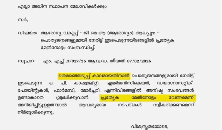 ആലപ്പുഴ: നിയമസഭാ തിരഞ്ഞെടുപ്പ് പടിവാതിൽക്കൽ നിൽക്കെ, സംസ്ഥാനത്തെ ആരോഗ്യമേഖലയിൽ അരങ്ങേറുന്ന തുടർച്ചയായ അനാസ്ഥകൾ സർക്കാരിനെ കടുത്ത രാഷ്ട്രീയ പ്രതിസന്ധിയിലാക്കുന്നു. സർക്കാരിന്റെ വികസന നേട്ടങ്ങളെക്കുറിച്ചുള്ള പ്രചാരണങ്ങളെ പ്രതിരോധിക്കാൻ പ്രതിപക്ഷം ഈ വീഴ്ചകൾ ആയുധമാക്കുകയാണ്. ഈ സാഹചര്യത്തിൽ, തെരഞ്ഞെടുപ്പ് കാലമായതിനാൽ അതീവ ജാഗ്രത വേണമെന്നാവശ്യപ്പെട്ട് ആലപ്പുഴ ഡിഎംഒ ആരോഗ്യ കേന്ദ്രങ്ങൾക്ക് നൽകിയ സർക്കുലർ പുറത്തുവന്നത് പുതിയ വിവാദത്തിന് വഴിതുറന്നു.