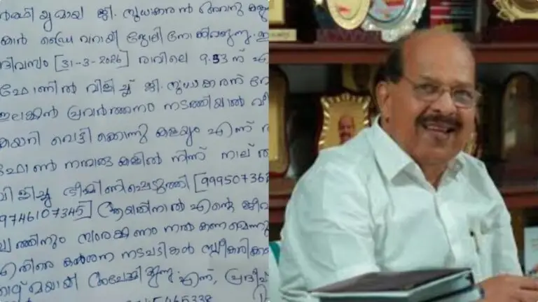 “ഞാൻ മുൻ മന്ത്രിയും നിലവിലെ അമ്പലപ്പുഴ മണ്ഡലത്തിലെ സ്വതന്ത്ര സ്ഥാനാർത്ഥിയുമായ ജി. സുധാകരൻ അവർകളുടെ കാർ ഡ്രൈവറായി ജോലി നോക്കിവരുന്നു. ഇന്നേ ദിവസം (31-3-2026) രാവിലെ 9:33-ന് എന്റെ ഫോണിൽ വിളിച്ച് ജി. സുധാകരന് വേണ്ടി ഇലക്ഷൻ പ്രവർത്തനം നടത്തിയാൽ വീട്ടിൽ കയറി വെട്ടിക്കൊന്നു കളയും എന്ന് രണ്ട് ഫോൺ നമ്പറുകളിൽ നിന്ന് നാല് തവണ വിളിച്ച് ഭീഷണിപ്പെടുത്തി (9995073622, 9746107345). ആയതിനാൽ എന്റെ ജീവനും സ്വത്തിനും സംരക്ഷണം നൽകണമെന്നും ടിയാൻമാർക്കെതിരെ കർശന നടപടികൾ സ്വീകരിക്കണമെന്നും താഴ്മയായി അപേക്ഷിക്കുന്നു.” – പ്രദീപ് കുമാർ
