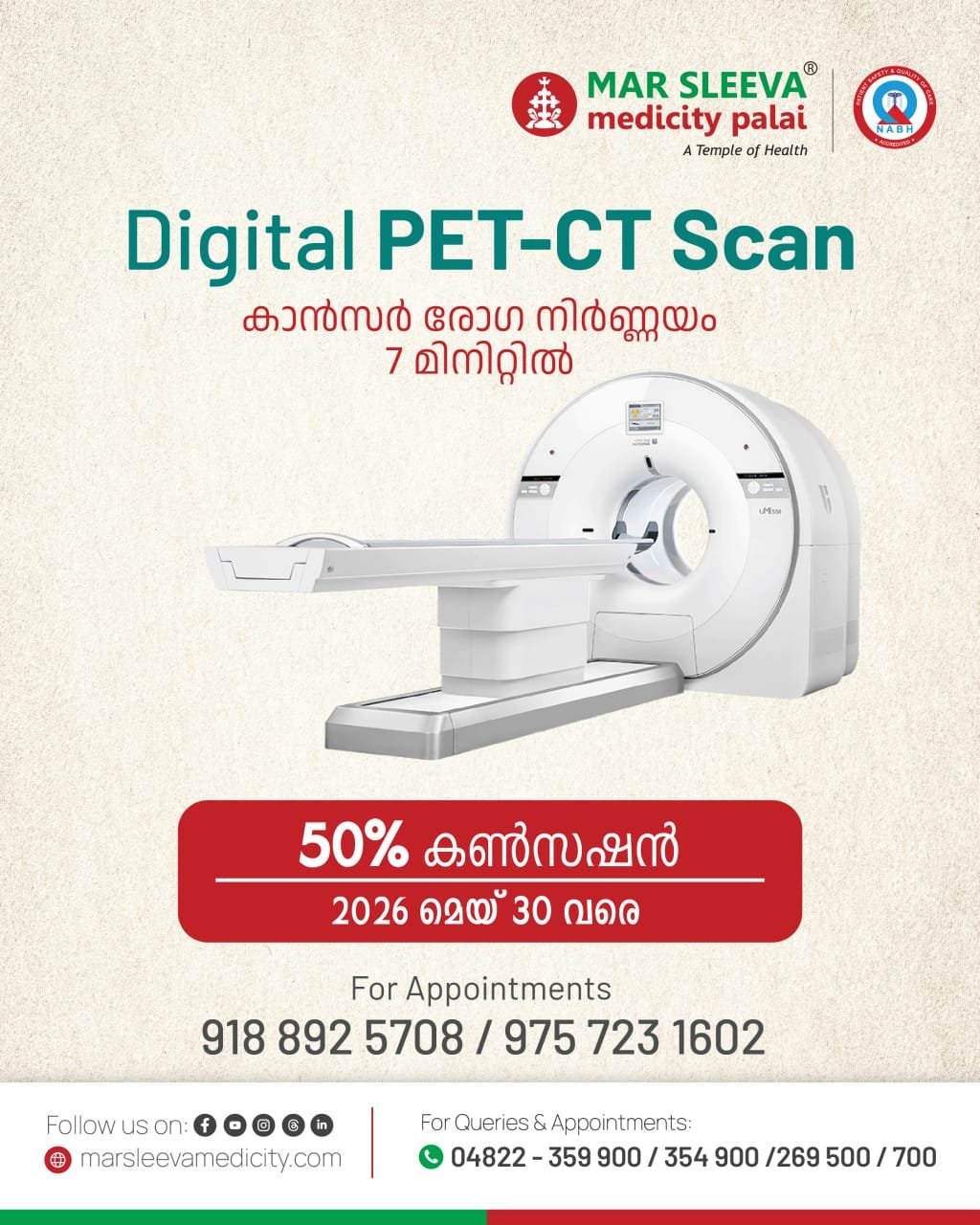 പാലാ : മാർ സ്ലീവാ മെഡിസിറ്റിയിൽ കാൻസർ രോഗനിർണയത്തിനുള്ള പെറ്റ് സ്കാൻ 50 % കുറവ് നിരക്കിൽ ചെയ്യാൻ അവസരം. 2026 മെയ് 30 വരെയാണ് കുറവ് നിരക്ക് ലഭ്യമാകുക.