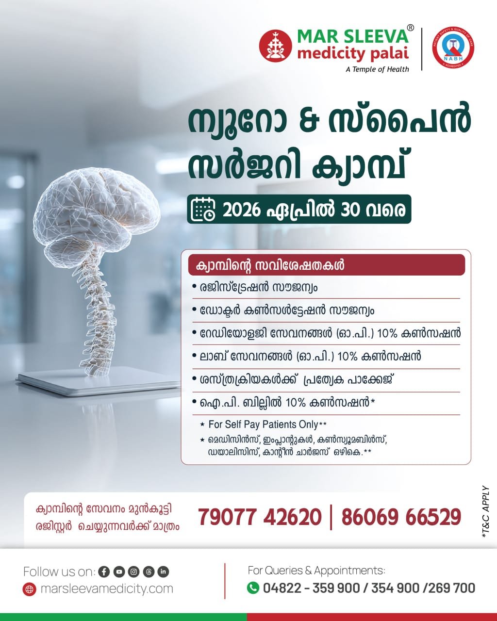 പാലാ : മാർ സ്ലീവാ മെഡിസിറ്റിയിൽ ന്യൂറോ ആൻഡ് സ്പൈൻ സർജറി ക്യാമ്പ് ഏപ്രിൽ 30 വരെ നടത്തും. നാഡീവ്യൂഹവും, നട്ടെല്ല് സംബന്ധവുമായ രോഗങ്ങൾക്ക് വിദഗ്ധ പരിശോധനയും ചികിത്സയും ക്യാമ്പിൽ പങ്കെടുക്കുന്നവർക്ക് ലഭ്യമാണെന്ന് ആശുപത്രി അധികൃതർ അറിയിച്ചു