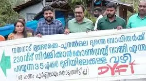 വയനാട് മുണ്ടക്കൈ ചൂരല്മല ദുരന്ത ബാധിതര്ക്ക് 230 വീട് നിര്മിക്കാന് കോണ്ഗ്രസ് വാങ്ങി എന്നു പറയുന്ന 3.5 ഏക്കര് ഭൂമിയിലേക്കുള്ള വഴി എന്നാണ് ബോര്ഡില് എഴുതിയിരിക്കുന്നത്.